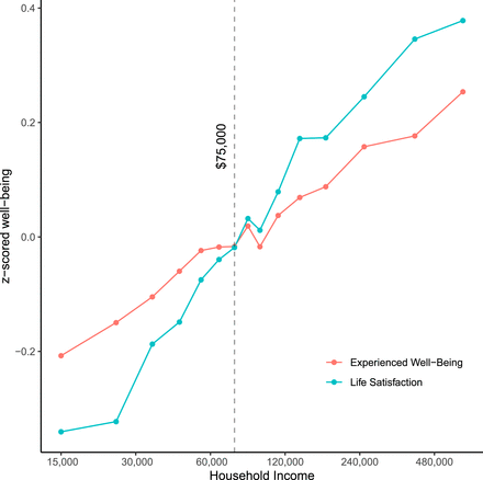 The title “Experienced wellbeing rises with income, even above $75,000 per year” sums up the findings.